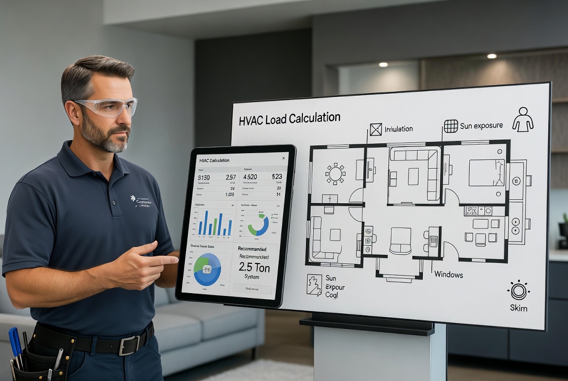 Professional HVAC contractors should use an ACCA Manual J load calculation, which is the ANSI‑recognized standard required by many building codes. This detailed calculation considers your actual home, not a generic model, and typically sizes equipment only up to about 15% above the calculated cooling load. [acca]